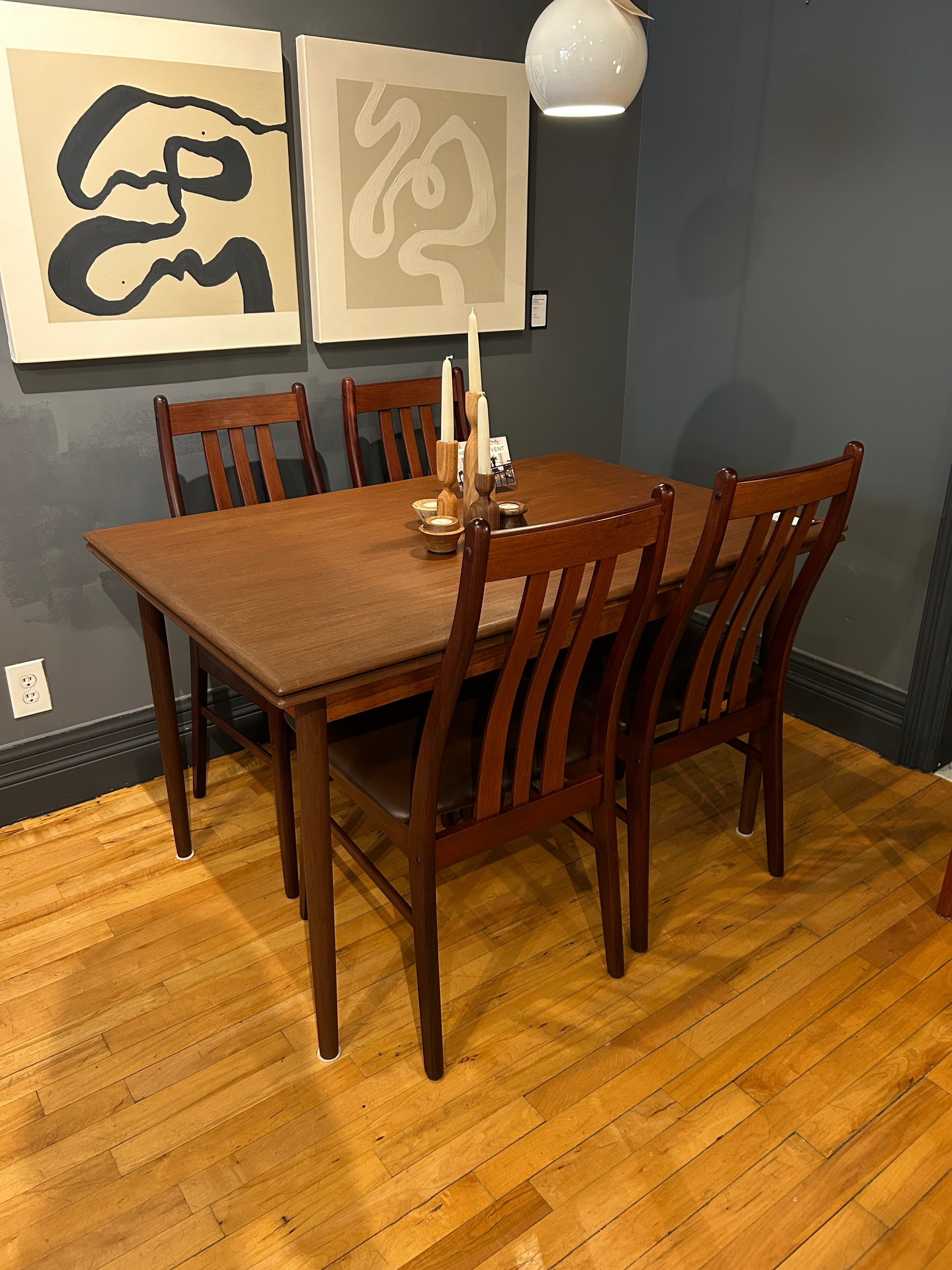 Elegant Danish craftsmanship meets everyday comfort. This vintage Farstrup chair features a sculpted frame with gently curved back slats that offer both support and visual lightness. The seat is upholstered in smooth brown leatherette, enhancing its warm, refined look. Subtle joinery details and soft edges make it a timeless mid-century piece.