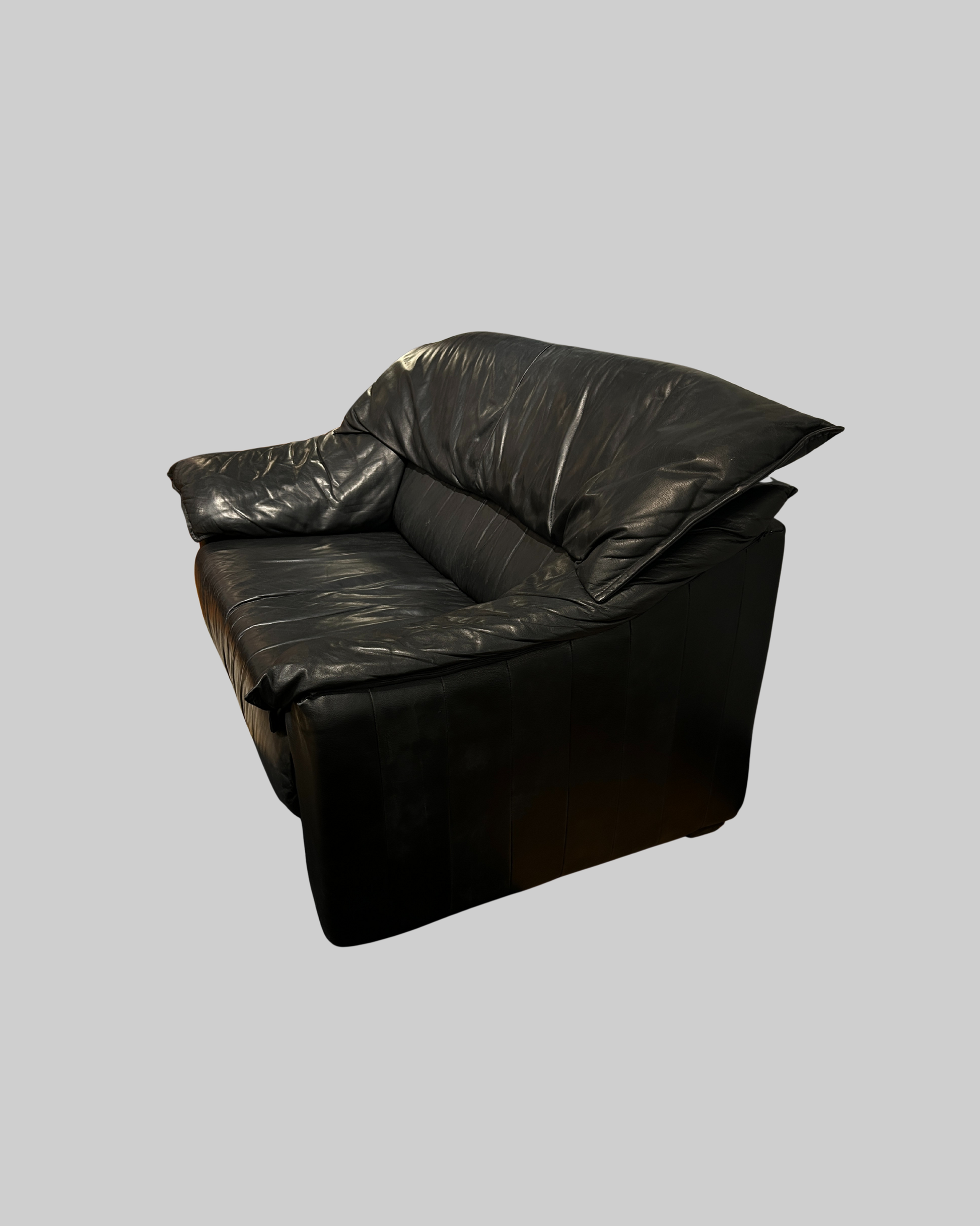 A bold, low-slung black leather loveseat sofa with deep, sculptural cushioning and an adjustable headrest that subtly shifts the silhouette from relaxed to supportive. The softly worn leather adds depth and character, while the generous proportions and slightly reclined posture place it firmly in late modernist design.