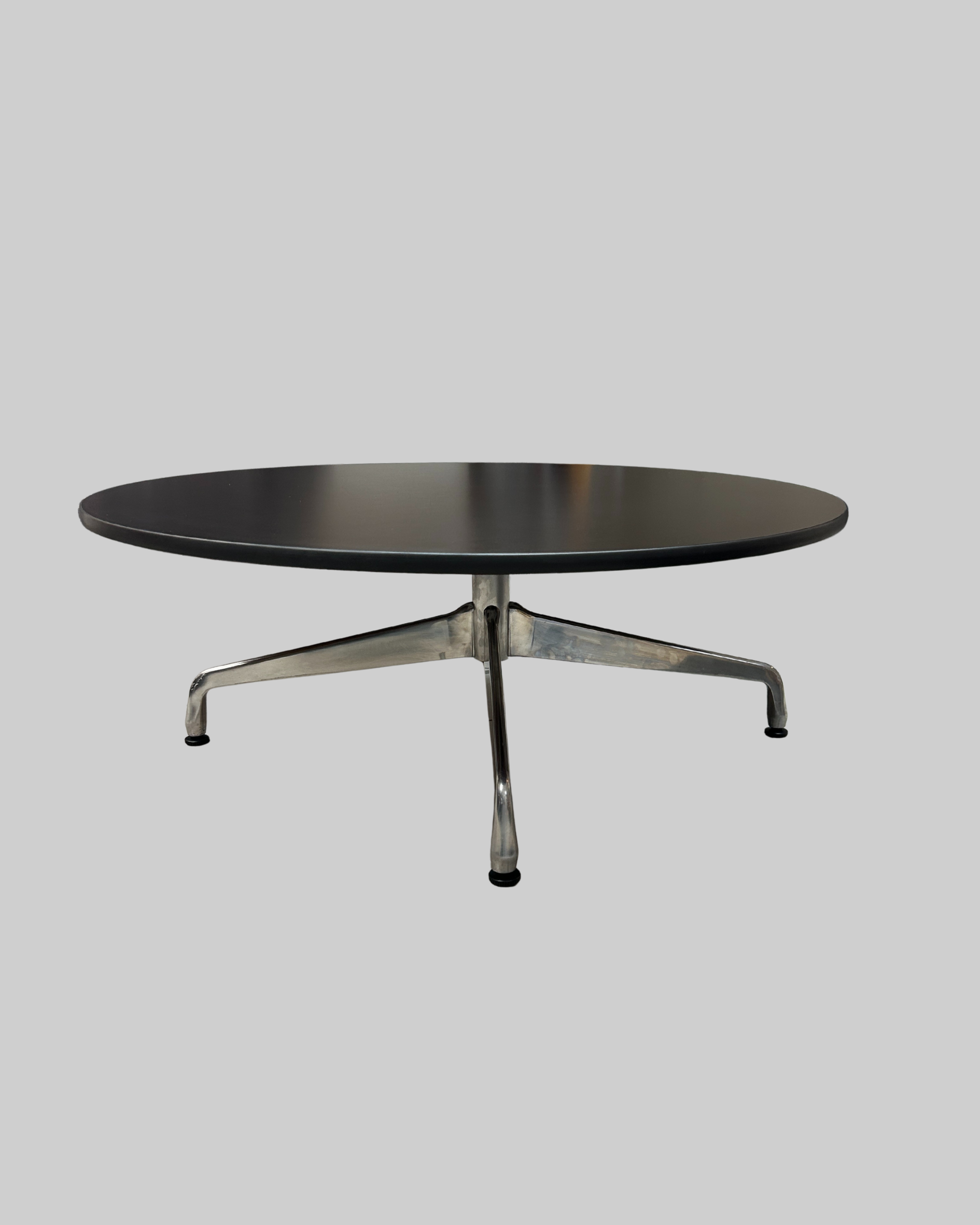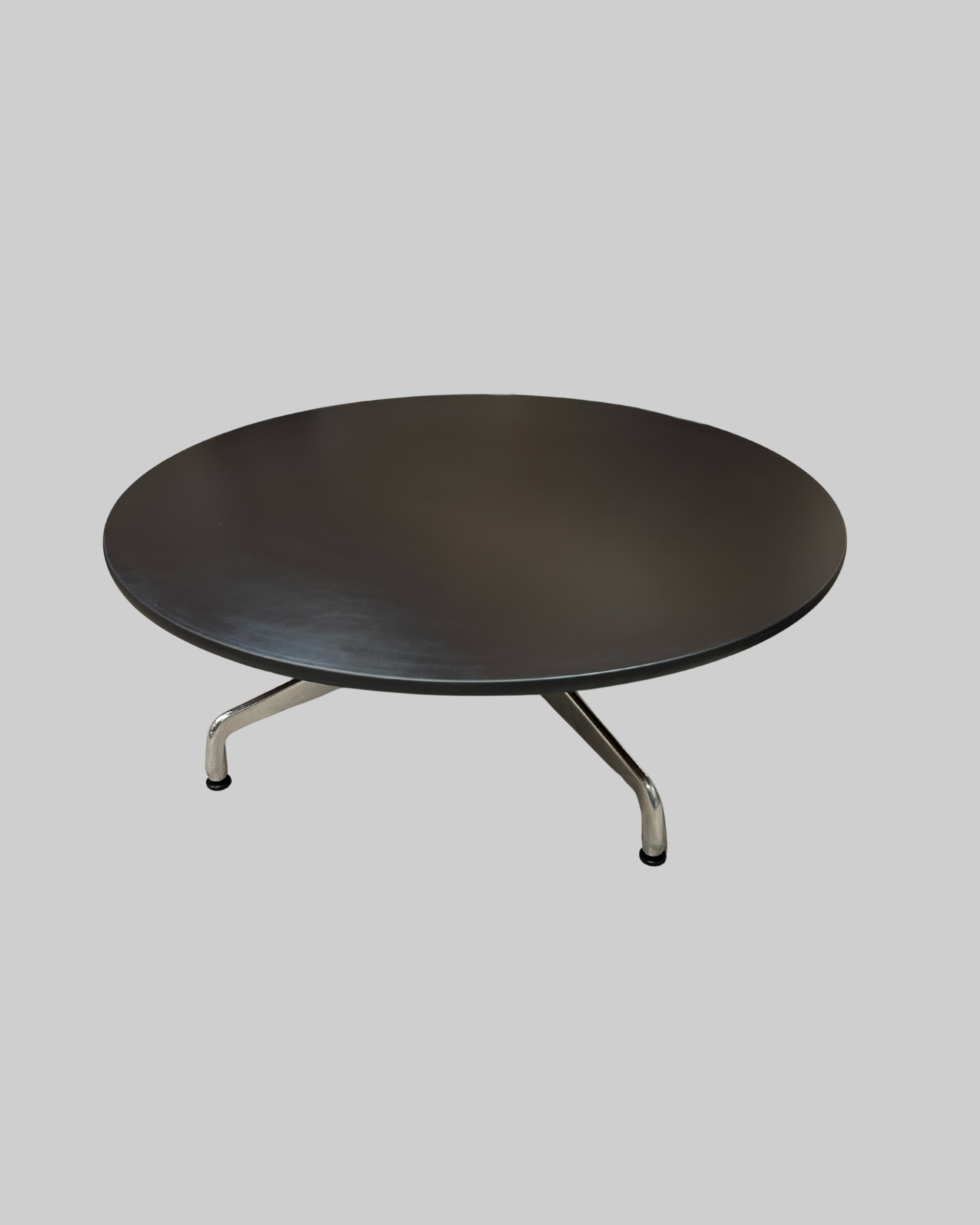 This classic Eames Round Coffee Table by Herman Miller brings signature mid-century clarity to any space. Featuring a 42" diameter top in a clean black laminate, it offers a minimalist aesthetic with practical durability. The exposed plywood edge and low 16" profile reflect the thoughtful detailing and efficient construction the Eameses are known for.
