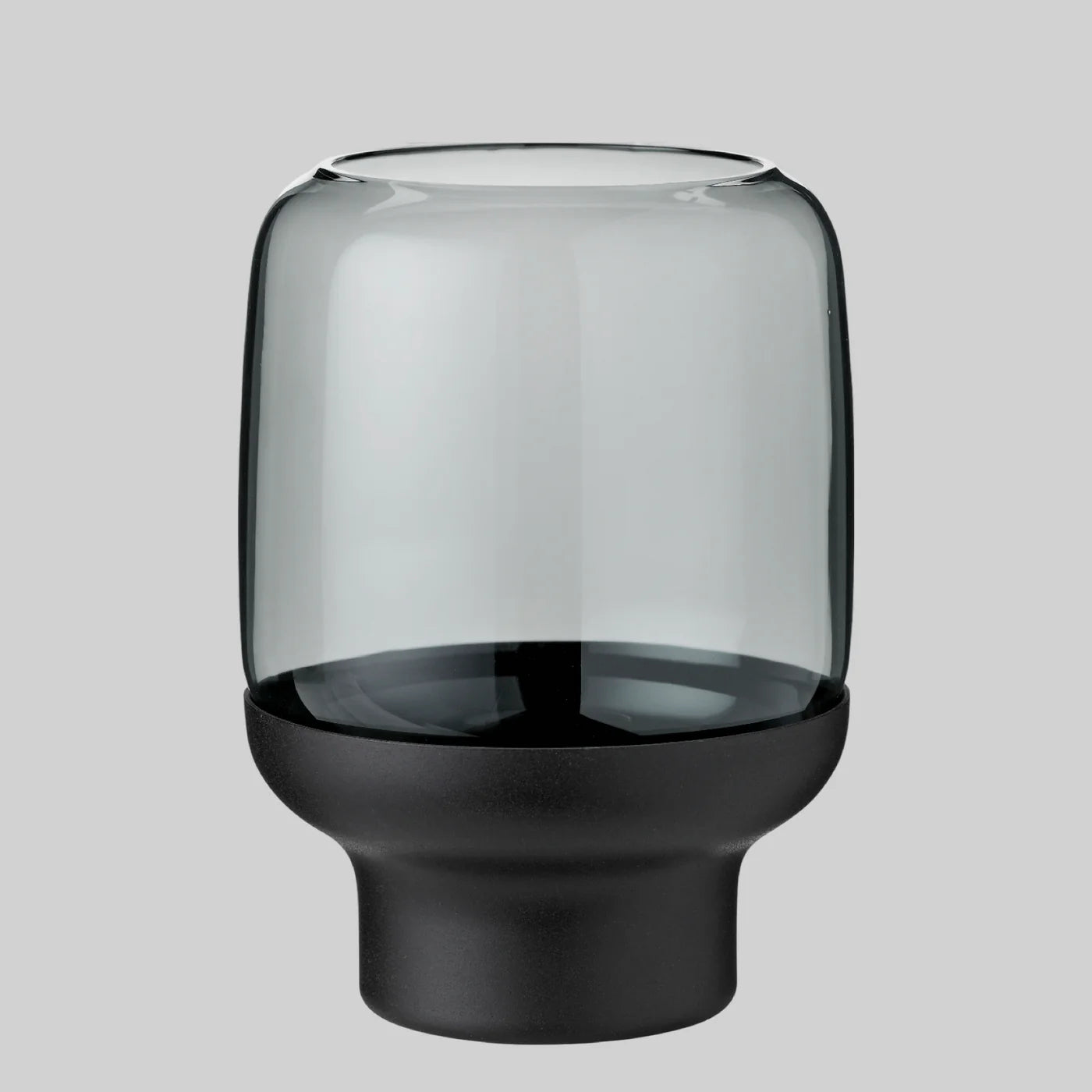 This sculptural hurricane lamp in smoke glass brings form and ambiance into harmony. Featuring softly curved walls and a fluid silhouette, it offers an elegant vessel for taper candles or LED lights.