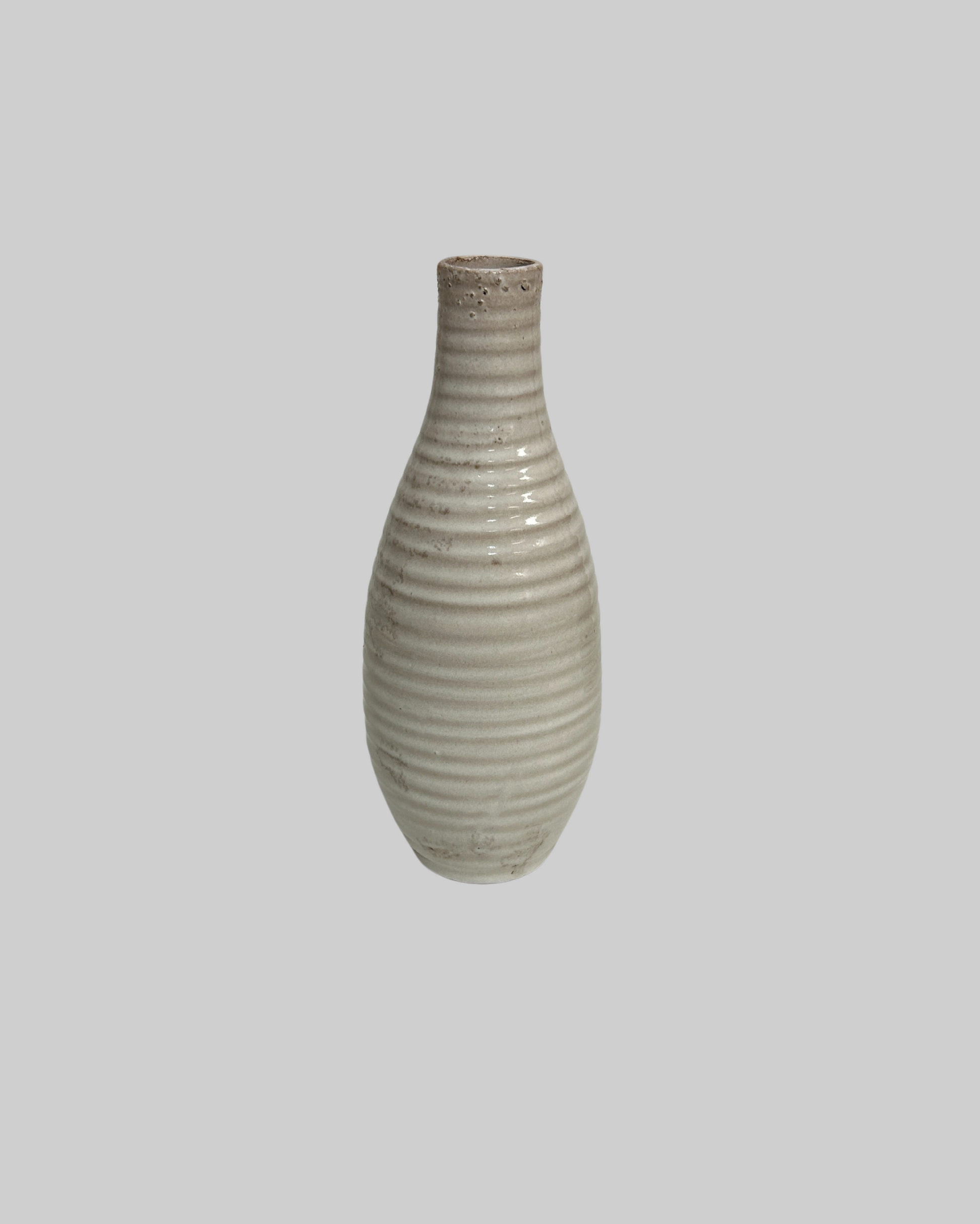 A slender ribbed ceramic vase with a rich glaze finish, its vertical lines accentuating the elongated silhouette. The tall, elegant profile makes it ideal for displaying single stems or as a sculptural accent on its own.