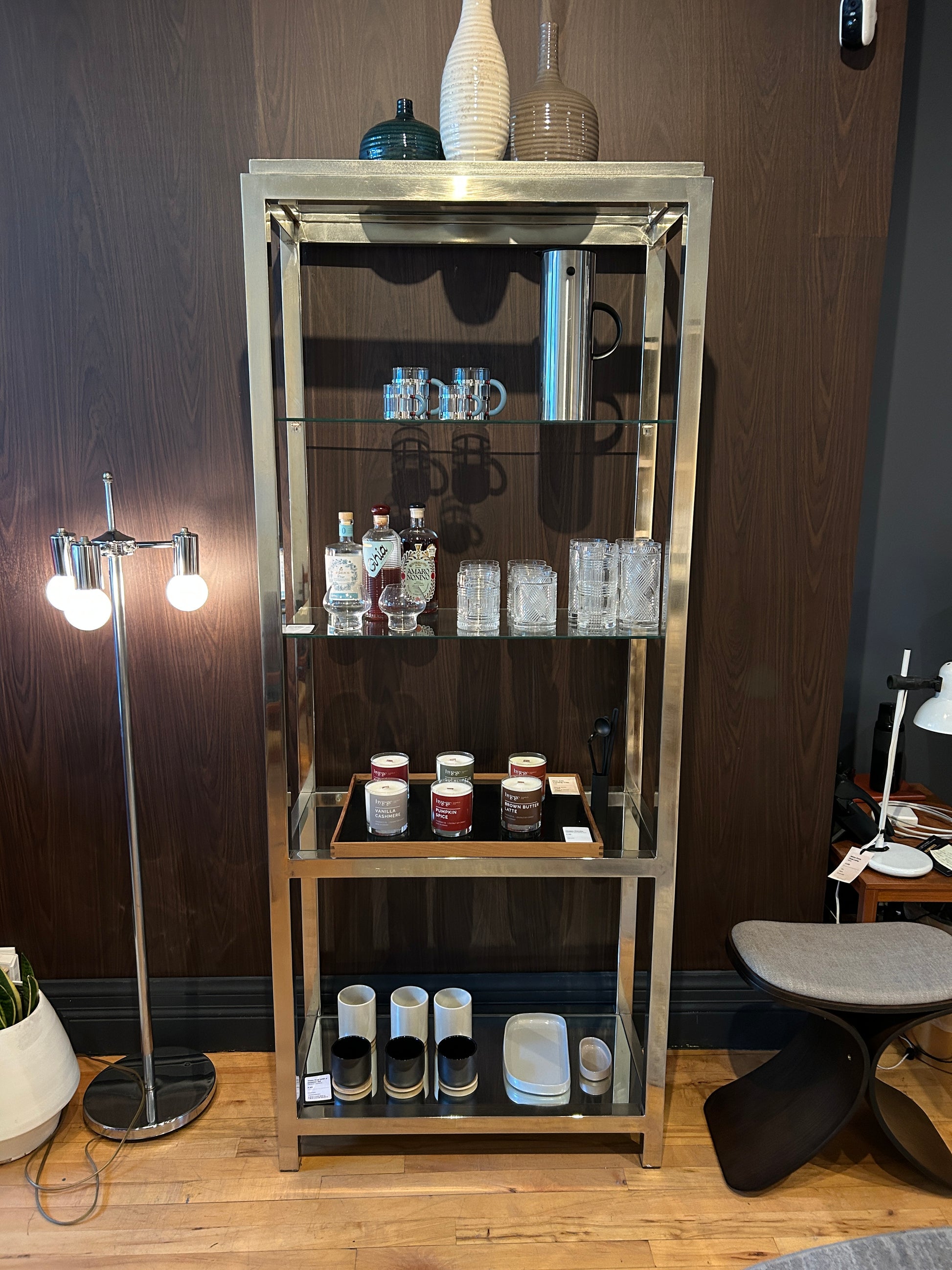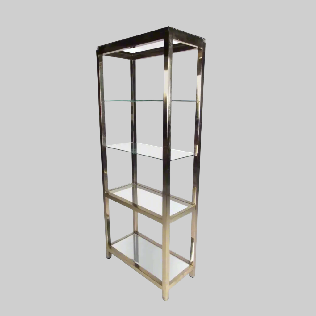 This stunning Mid-Century Modern etagere features a polished brass frame that exudes timeless elegance. The lowest shelf is a beautifully reflective mirror, creating a touch of luxury and depth, while the shelves above are crafted from clear glass, providing a sleek, transparent display space. Its open design ensures a light, airy feel, perfect for showcasing books, art, or decorative objects.