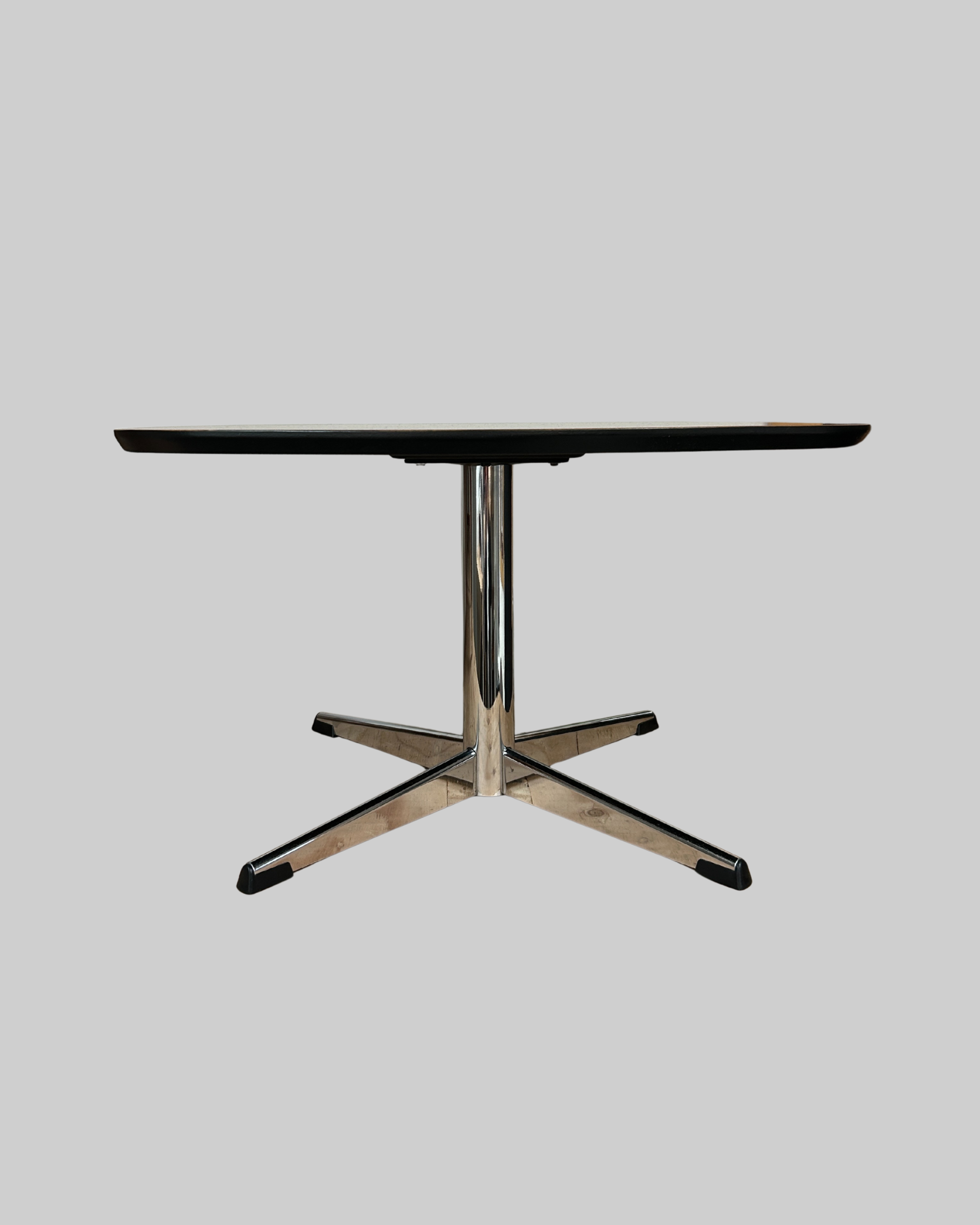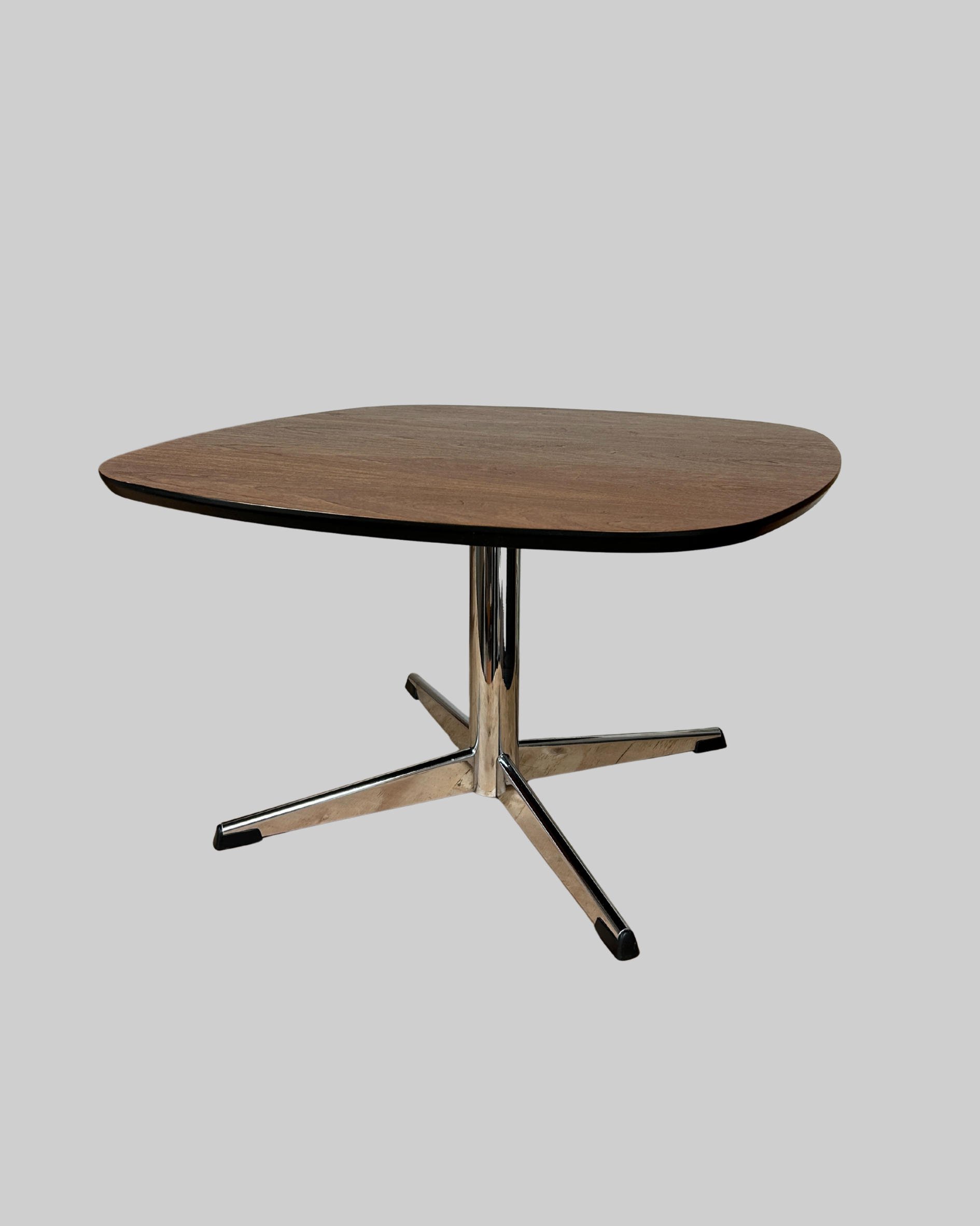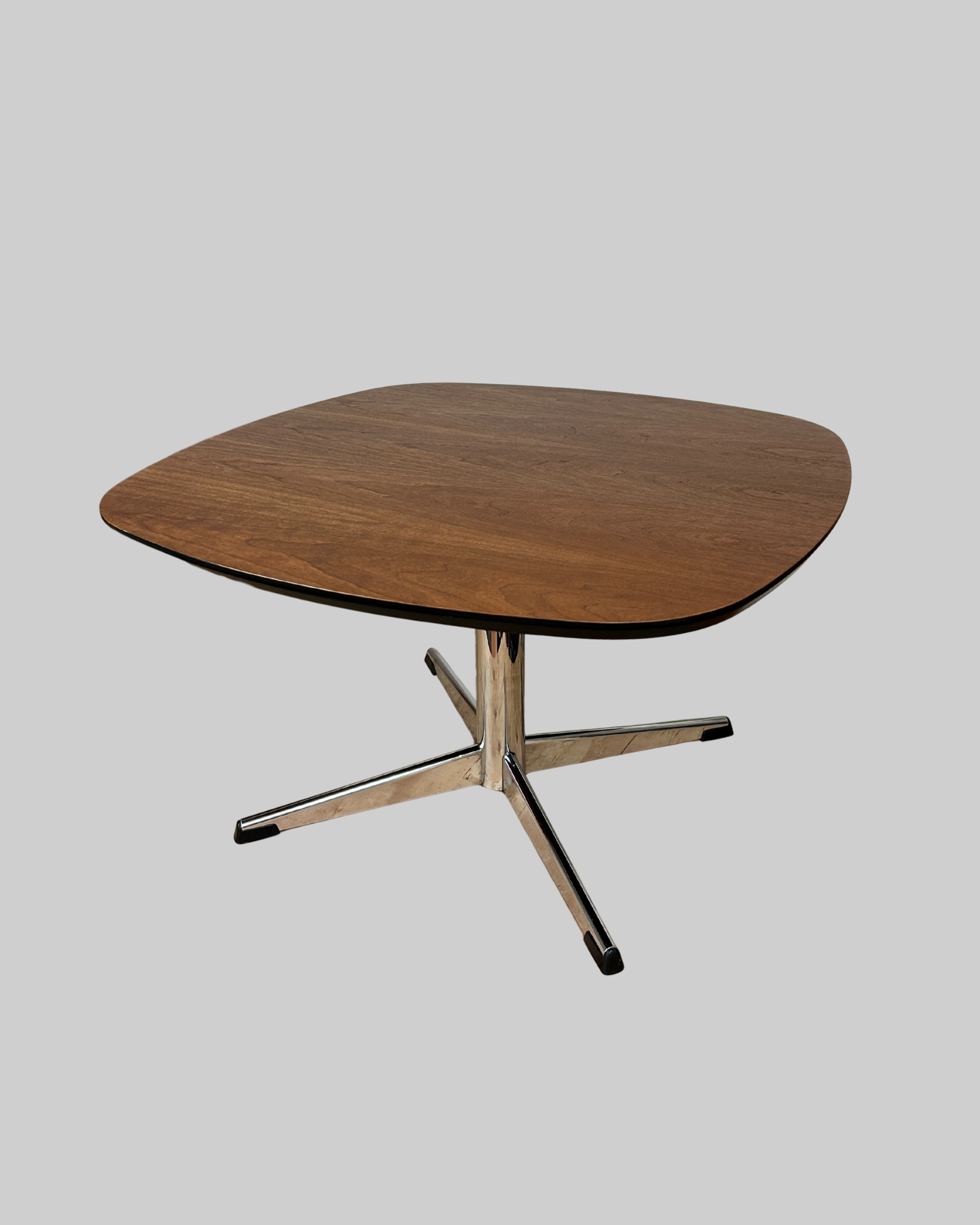 A striking mid-century oval dining table with a refined walnut top resting on a polished chrome pedestal base. The sculptural star-shaped legs give it a confident presence while keeping the silhouette light and airy.
