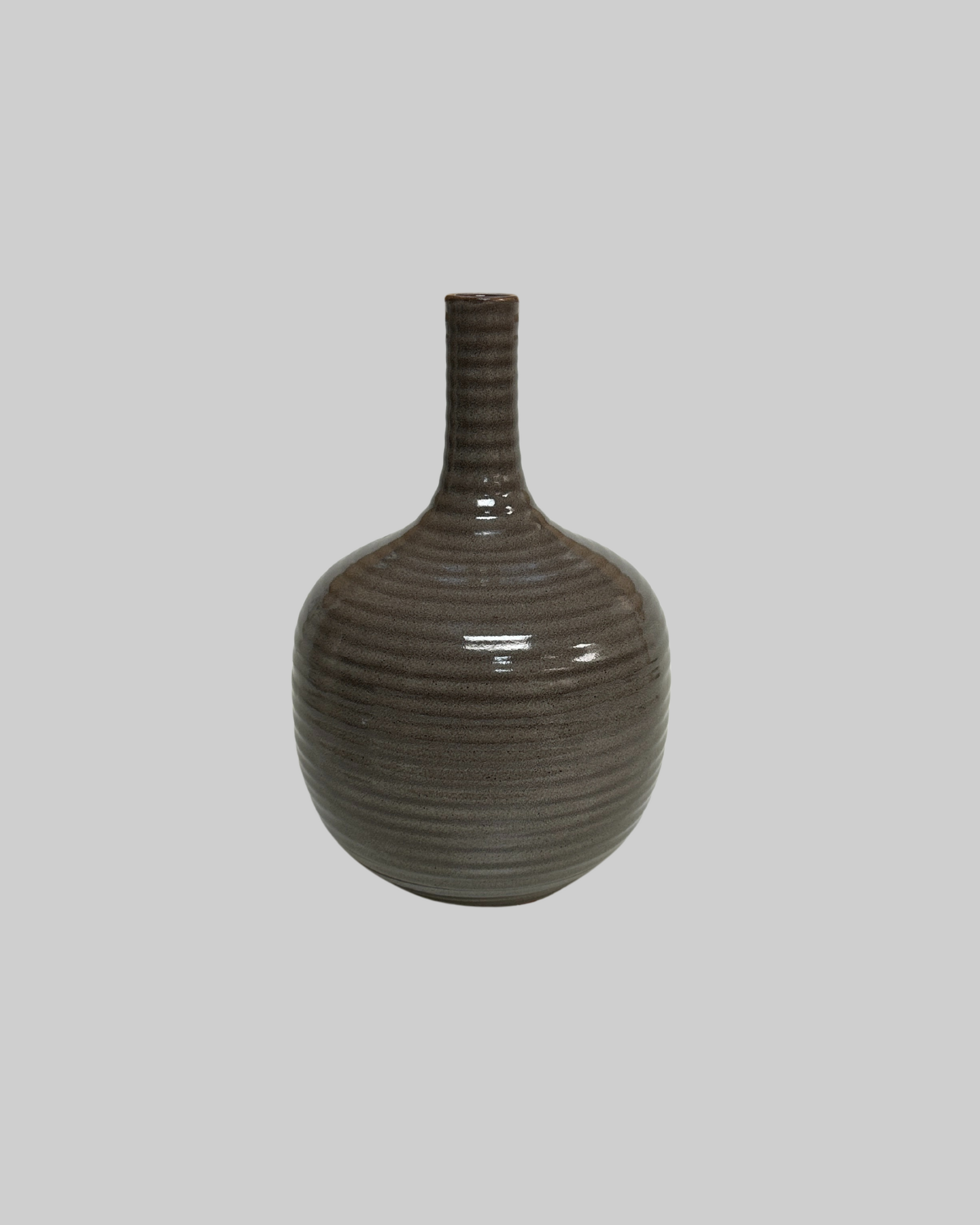This ribbed ceramic vase balances a rounded body with a slim, elongated neck. The glazed surface enhances its sculptural form, while the ribbing adds depth and movement.