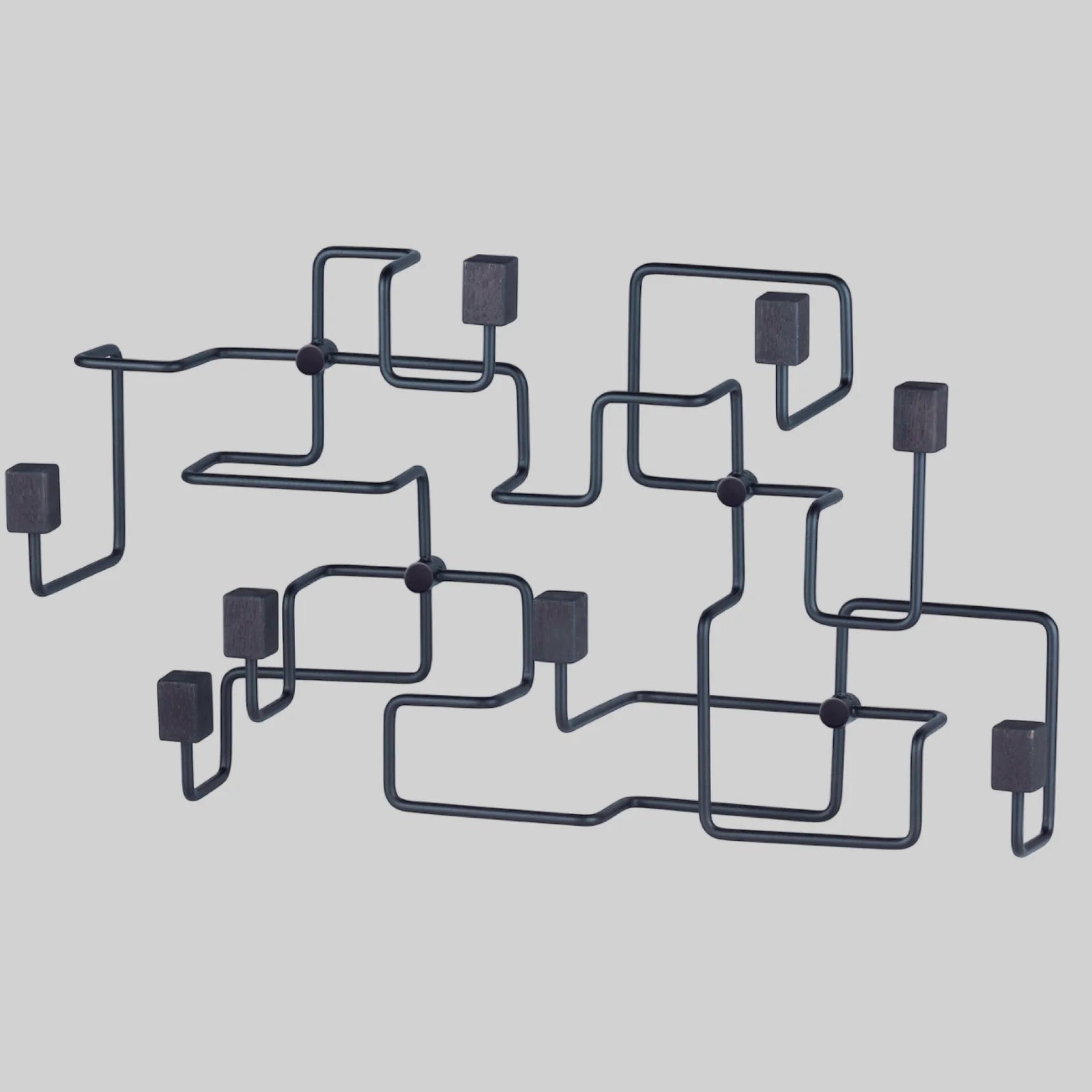 Inspired by the iconic London underground train system, the Underground Coat Rack combines bold design with practical functionality. Its displaced levels and sculptural lines create a visually striking piece, while the matte surface treatment and solid oak accents lend a raw yet stylish finish. Originally launched in 2013 by Gejst Design, this coat rack is a perfect balance of function and art.