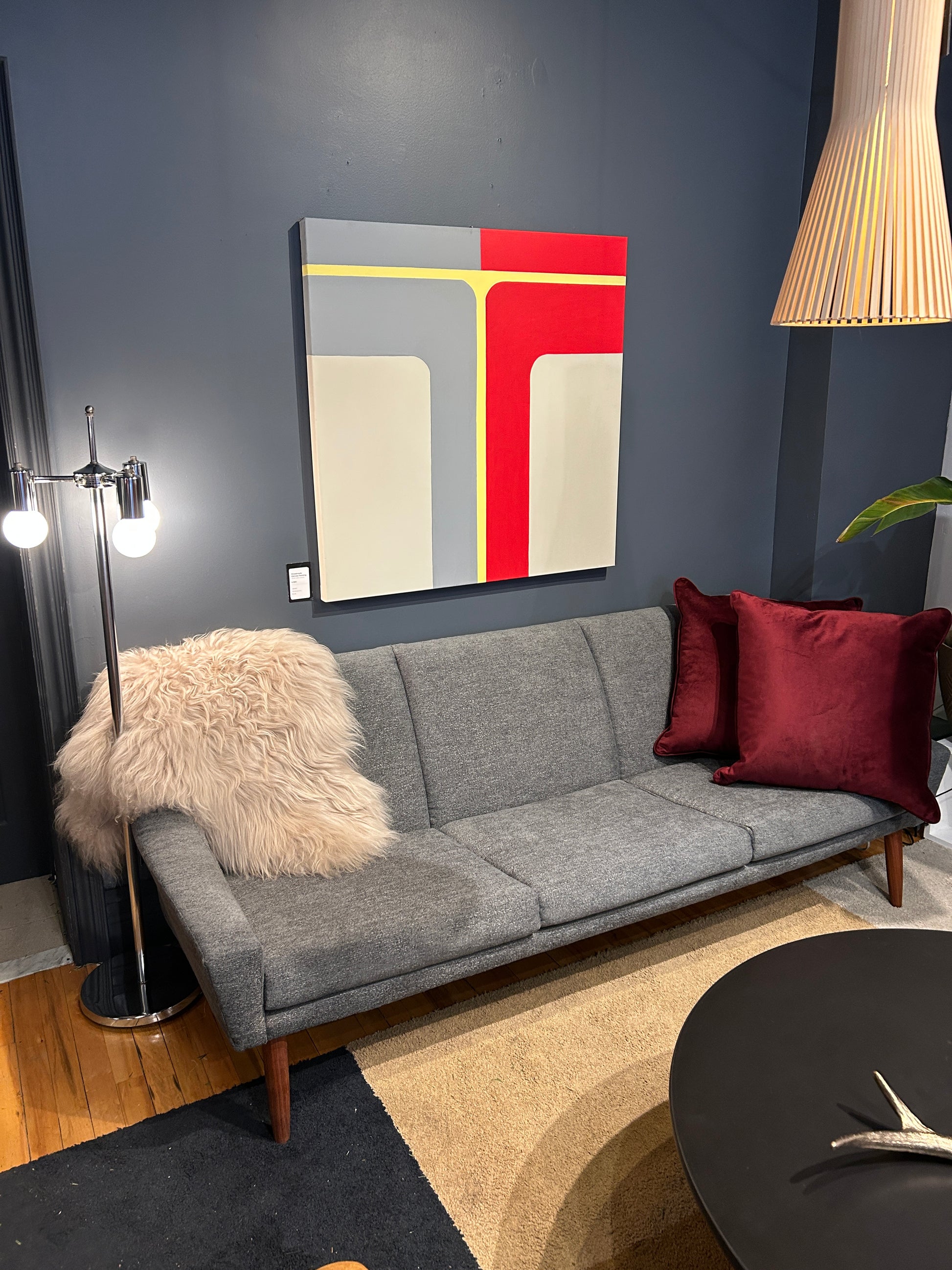 A sculptural mid-century sofa with a gently winged profile, crisp tailoring, and warm tapered teak legs. Its long, continuous silhouette and soft grey upholstery give it that perfect blend of elegance and ease, refined without ever feeling formal.